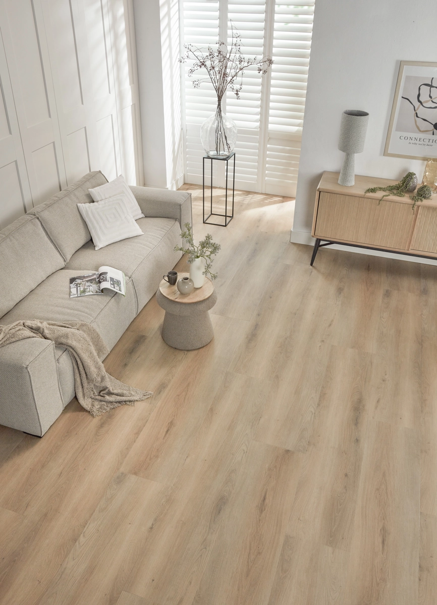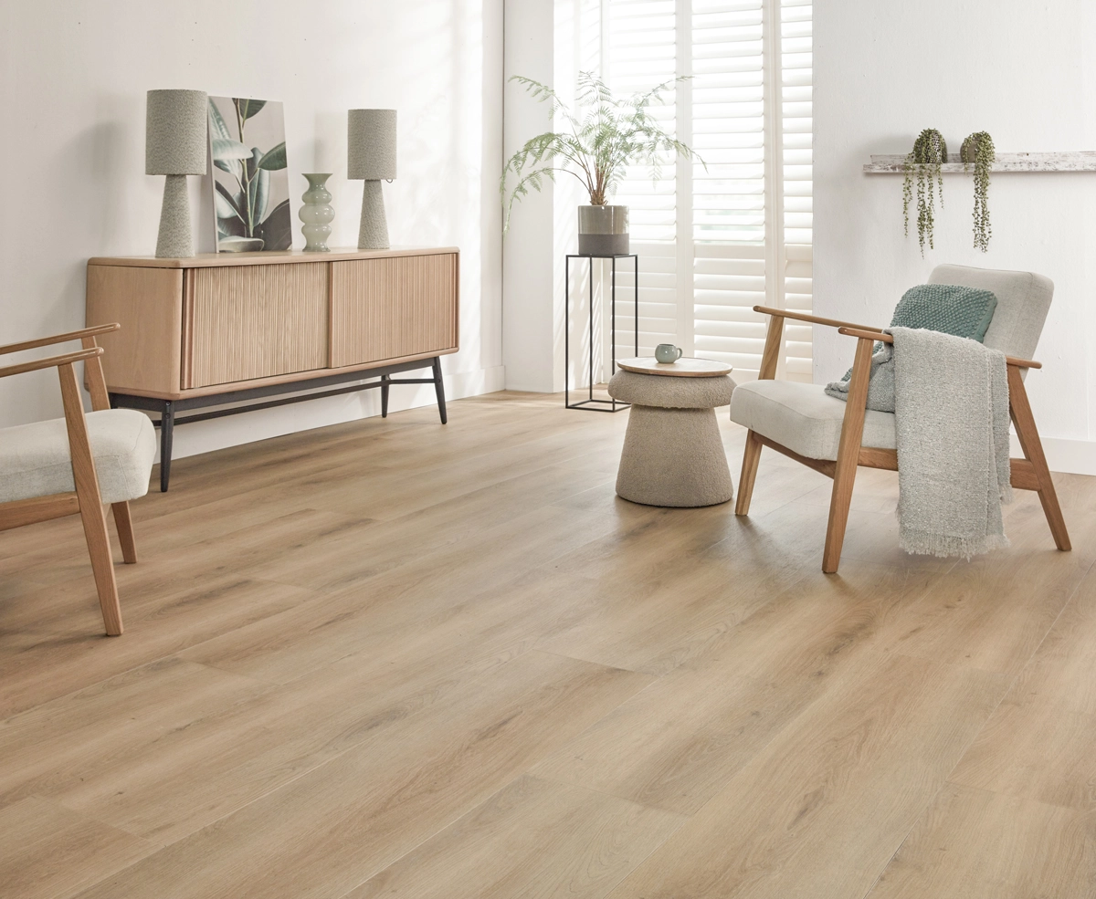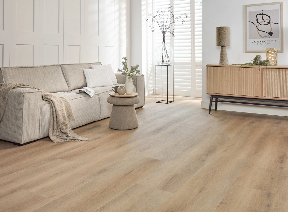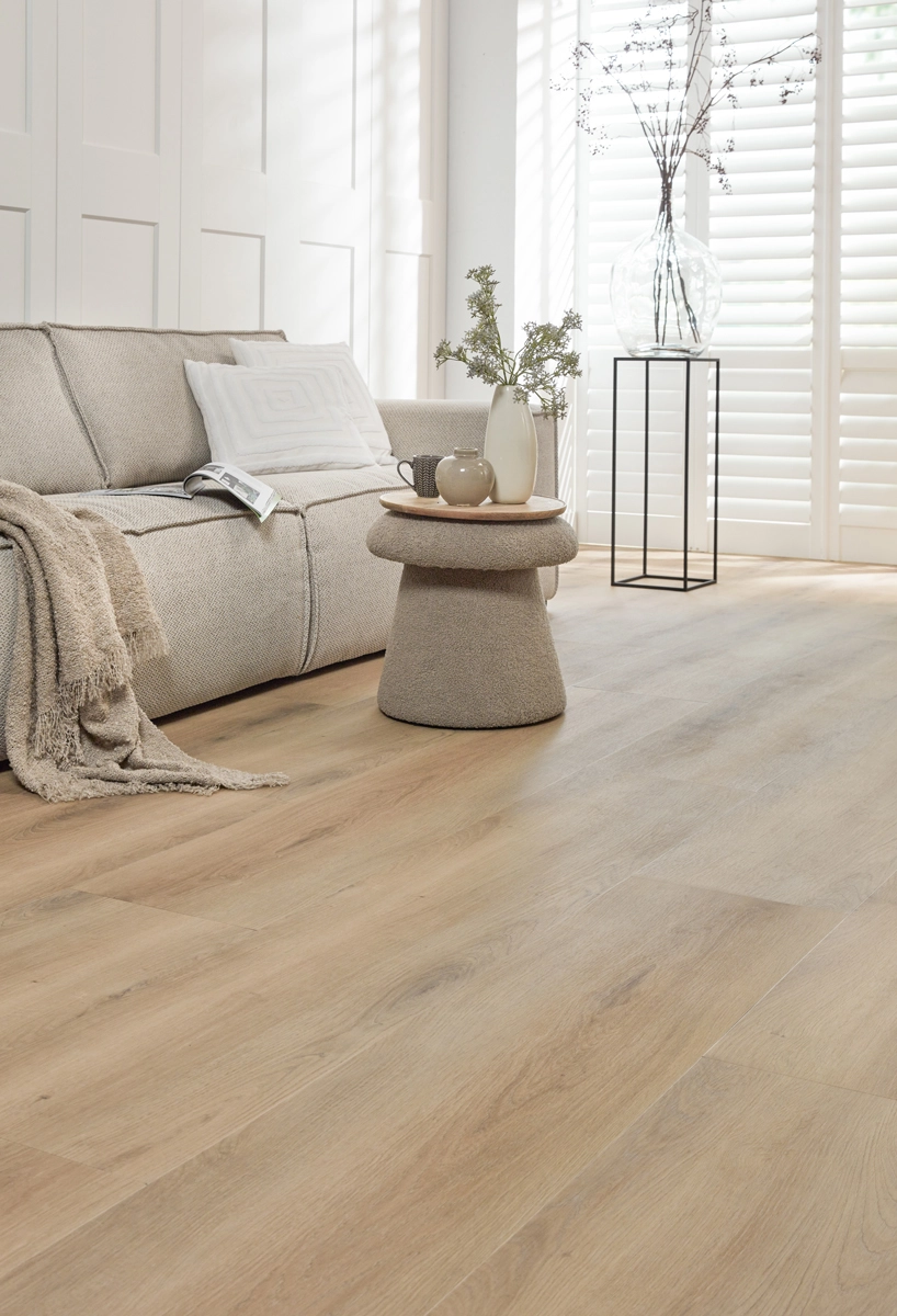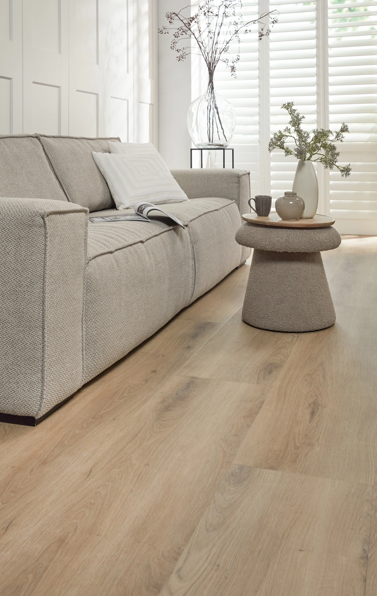 De Landelijke Eik combineert een karaktervolle uitstraling met een slijtvaste toplaag van 0,55 mm. Hierdoor is deze vloer geschikt is voor intensief huishoudelijk en commercieel gebruik. De MEGAMAT afwerking voorkomt hinderlijke reflecties en zorgt voor een natuurlijk, mat oppervlak. De subtiele microvelling rondom elke plank benadrukt het royale formaat en geeft de vloer een stijlvolle finishing touch. Met een warmteweerstand van slechts 0,019 m²K/W is deze vloer perfect te combineren met vloerverwarming en -koeling.