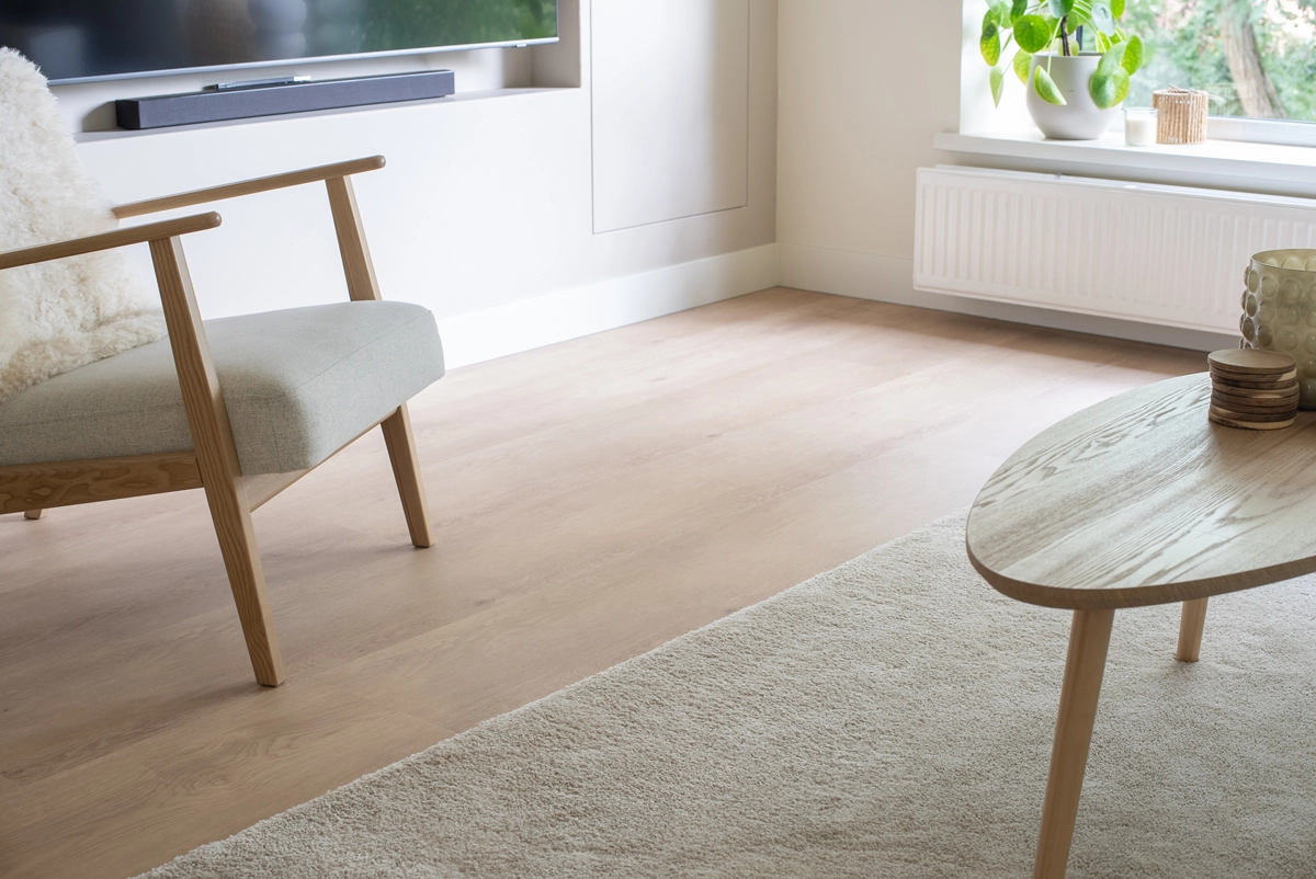 De Witte Eik is niet alleen een lust voor het oog, maar ook van topkwaliteit. Met een slijtvaste toplaag van 0,55 mm is deze vloer bestand tegen intensief gebruik, ook in commerciële ruimtes. De MEGAMAT afwerking zorgt voor een stijlvolle, matte look zonder vervelende reflecties. De subtiele microvelling rondom elke plank benadrukt de royale XXL afmetingen. Dankzij de lage warmteweerstand van slechts 0,019 m²K/W is deze vloer uitstekend te combineren met vloerverwarming en -koeling