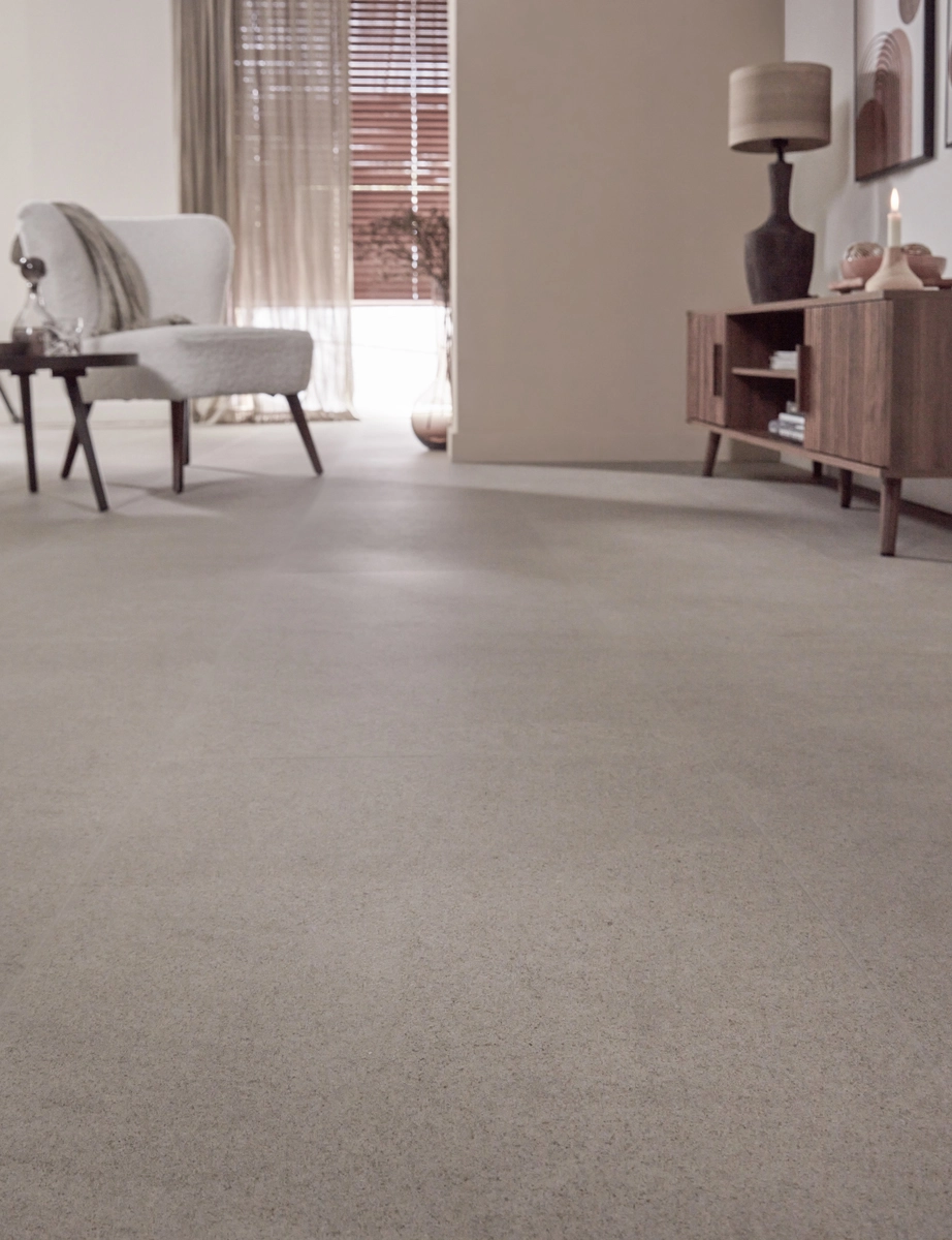 petters, natte schoenen of een omgevallen glas? Geen probleem voor deze greige tegelvloer! Dankzij de 100% waterbestendige afwerking voelt hij zich helemaal thuis in de keuken, hal of badkamer. Met een warmteweerstand van slechts 0,039 m²K/W is deze vloer ook perfect te combineren met vloerverwarming én vloerkoeling. Warm, stijlvol én praktisch dus.