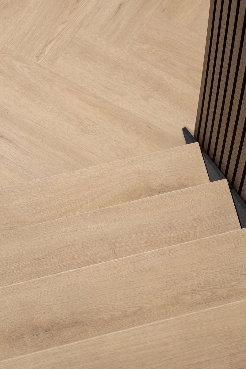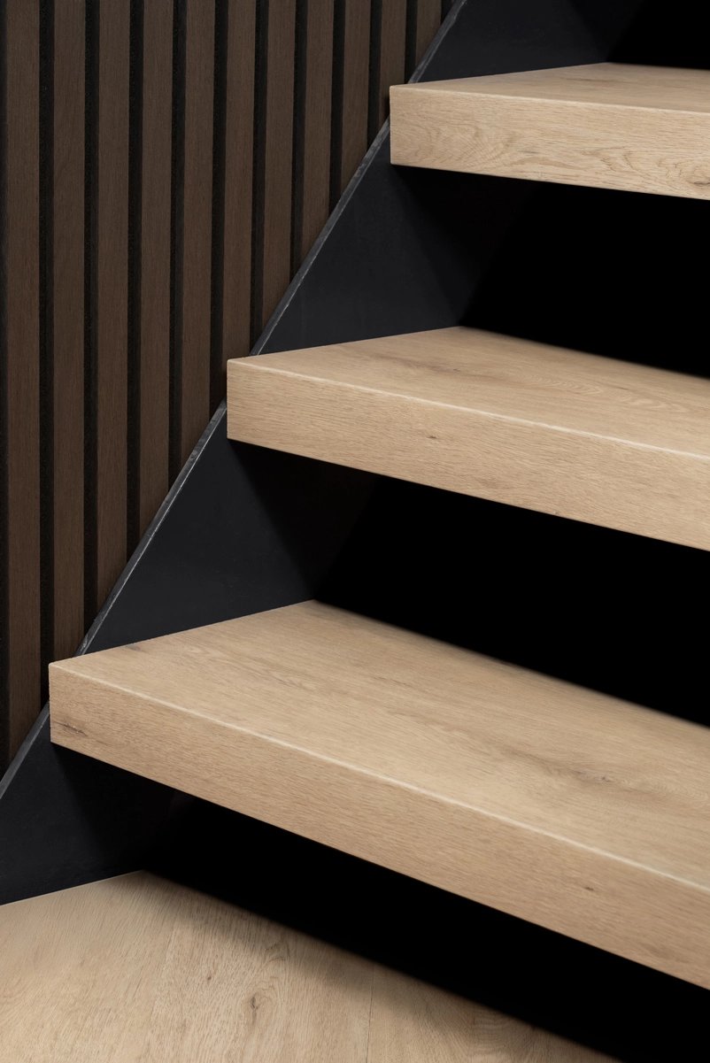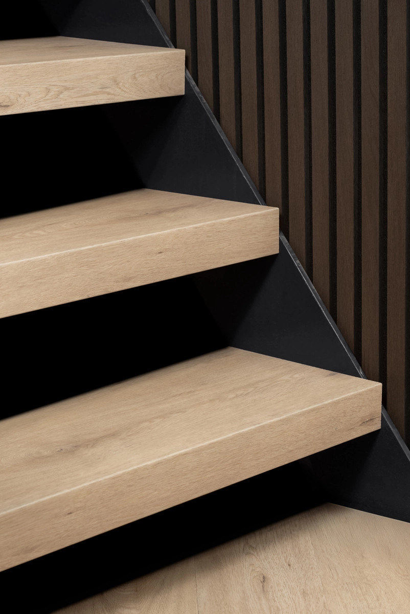 Dankzij de diepte van 66,5 cm en de afgeschuinde neuzen aan beide zijden, zijn deze ondertreden ideaal om een open- trap volledig te bekleden. De ondertreden zijn eenvoudig op maat te zagen, waardoor je twee panelen uit één trede haalt – perfect voor een efficiënte plaatsing. Combineer ze met bijpassende boventreden om de trap rondom af te werken. Heb je een extra lange traptrede nodig? Naast de 100 cm boventreden, zijn er ook 138 cm lange treden beschikbaar.