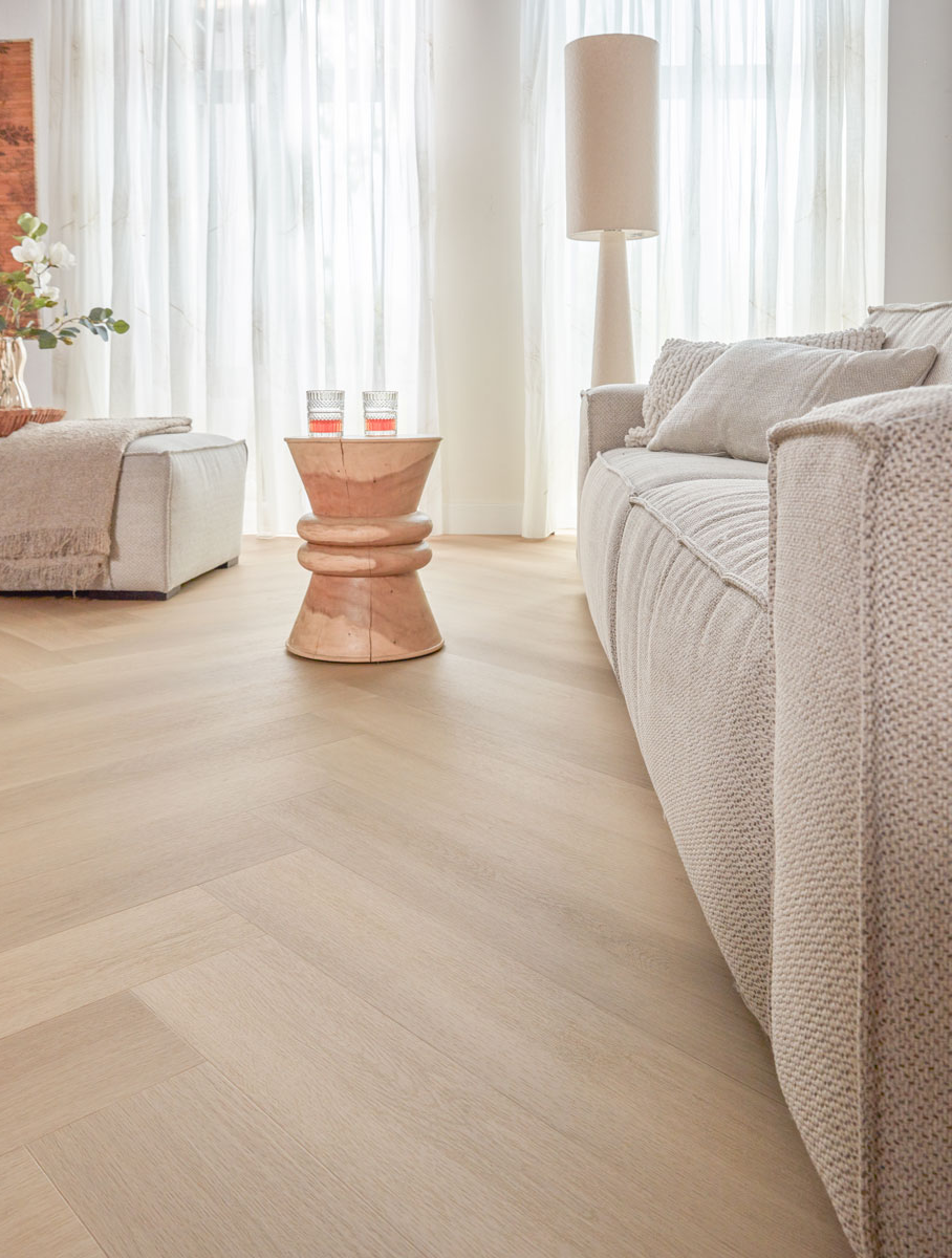 Een vloer met karakter én comfort? Dan zit je goed met Zwaardvis Zand uit de Walvisgraat Click Vinyl collectie. De zachte zandtint brengt rust in je interieur, terwijl het royale XL visgraatpatroon zorgt voor een stijlvol en ruimtelijk effect. De matte MEGAMAT afwerking voorkomt hinderlijke lichtreflecties en laat de vloer extra natuurlijk ogen. In combinatie met de voelbare houtstructuur en de vierzijdige microvelling krijgt je vloer nét dat beetje extra diepte en detail. Daardoor is hij bijna niet van echt parket te onderscheiden, maar dan mét alle voordelen van vinyl.