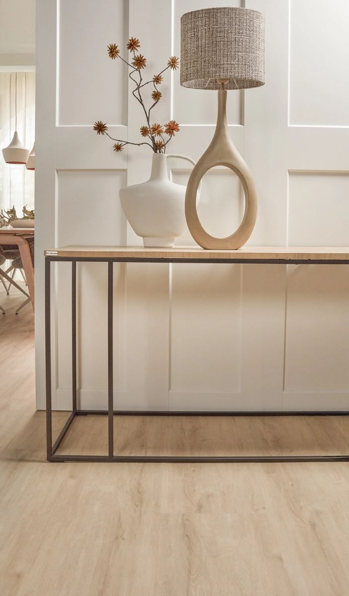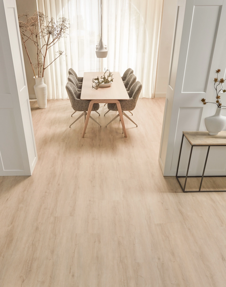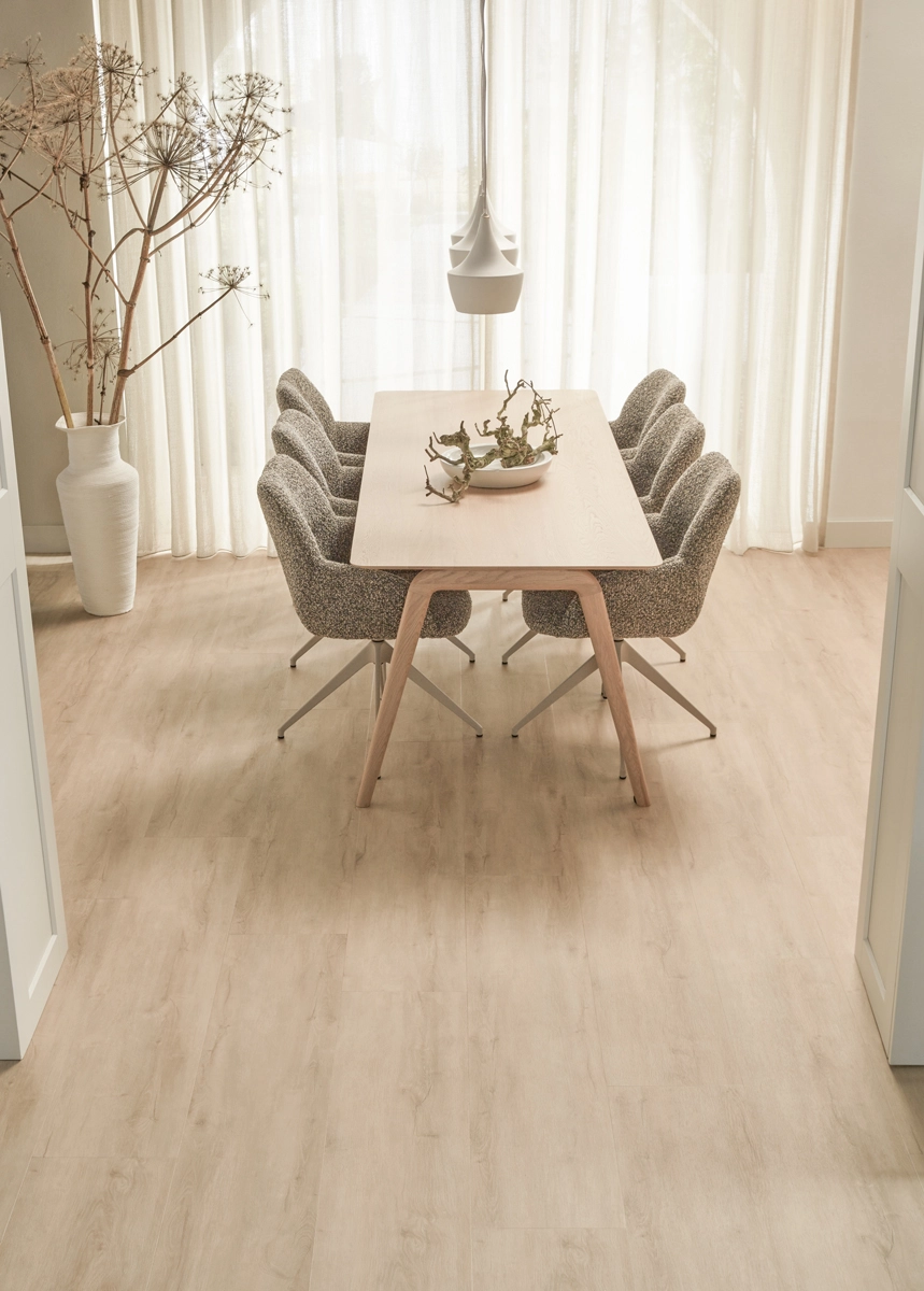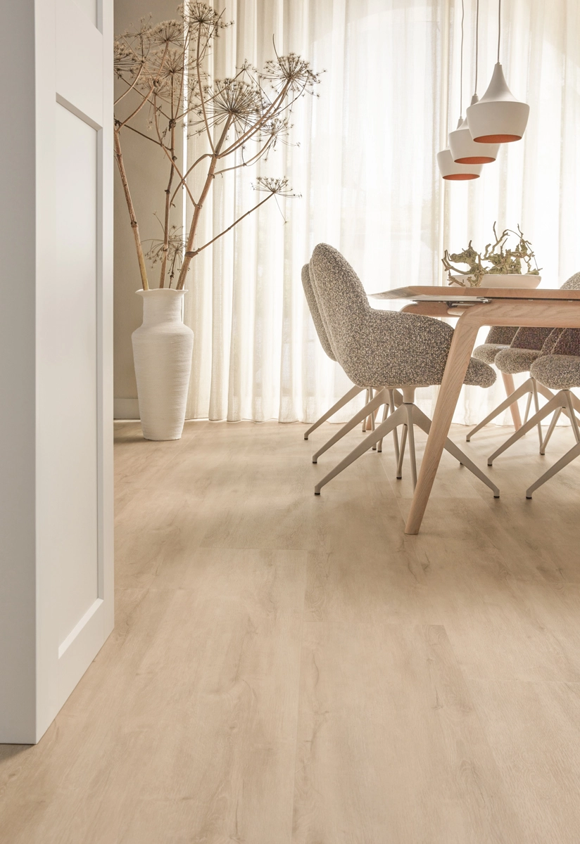 Achter het uiterlijk van de Crème Eik gaat een stevige kwaliteit schuil. De vloer is voorzien van een slijtvaste toplaag van 0,55 mm en daarmee ook geschikt voor intensief gebruik, zelfs in commerciële ruimtes. De MEGAMAT afwerking voorkomt glans en zorgt voor een natuurlijk, mat oppervlak. De microvelling rondom elke plank versterkt het royale karakter van deze XXL vloer. En met een lage warmteweerstand van 0,019 m²K/W is deze PVC vloer perfect te combineren met vloerverwarming en vloerkoeling.